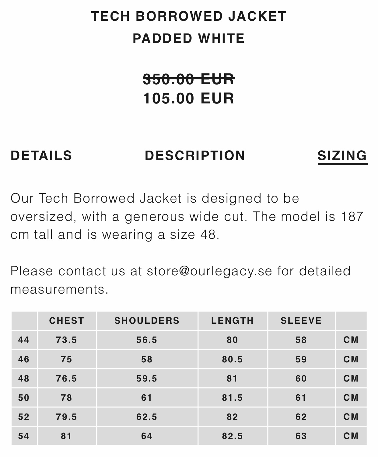 공홈에서는 다 팔린 제품이 사라지지만 구글에서 제품명을 검색하면 아직까지 제품의 페이지가 살아있는 걸 알 수 있다. 내가 구입 한 사이트에서 상세 사이즈 표가 없어서 구글에서 디깅으로 사이즈 표를 찾았다.
