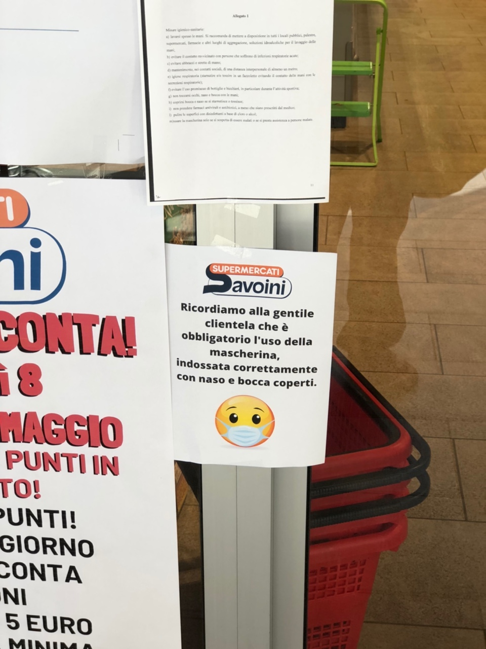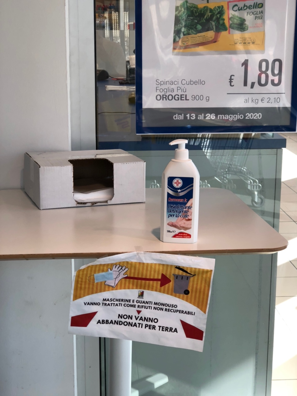 이제는 이탈리아도 마스크를 필수로 사람들이 인식하고 있다. 진짜 몇 개월 사이에 많은 것이 변했다. 슈퍼 입장 전에 마스크 착용을 검사하고 앞에 손 소독제와 일회용 장갑이 비취되어 있다.