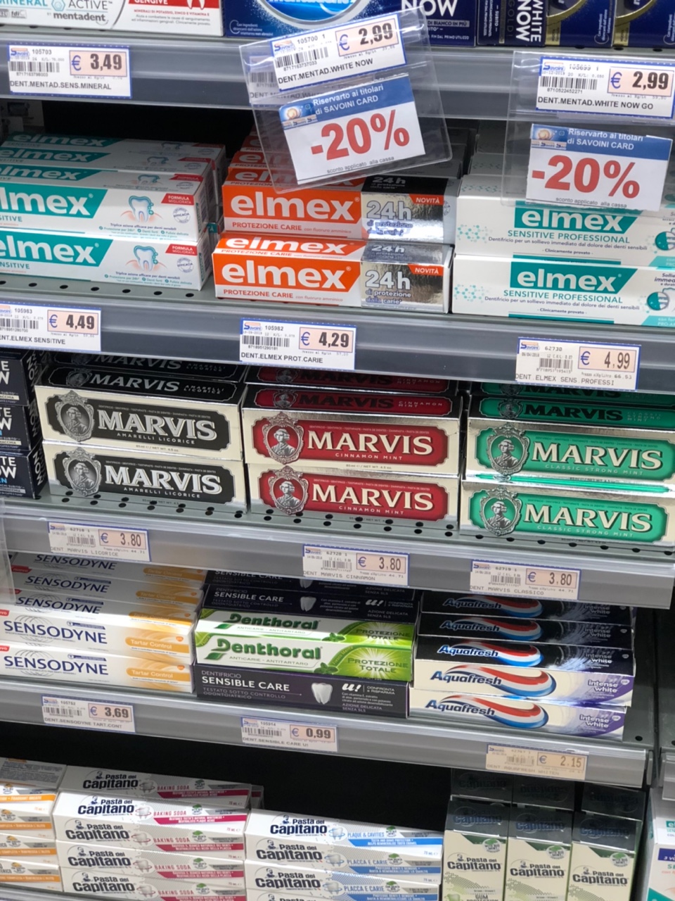 이탈리아 여행 후 많이 들 선물용으로 사간다는 마르비스 치약. 보통 한국에서 구하면 한 개에 1만 원 정도 한다고 하던데 이탈리아 슈퍼에는 이 정도 가격이다. 약국 말고 슈퍼에서 구입하는 것이 확실히 저렴하다. 나도 사용하냐고? 아니 나는 제일 저렴한 세일 상품으로 한 번에 10개로 구입한다. 이런 치약 하나하나에 내 시간 쓰기 아깝다. 치약 휴지 샴푸 이런거는 진짜 한번에 와장창 사 두어야지 잔 고민을 더는 방법이라고 나는 생각한다. 그냥 그렇다고...