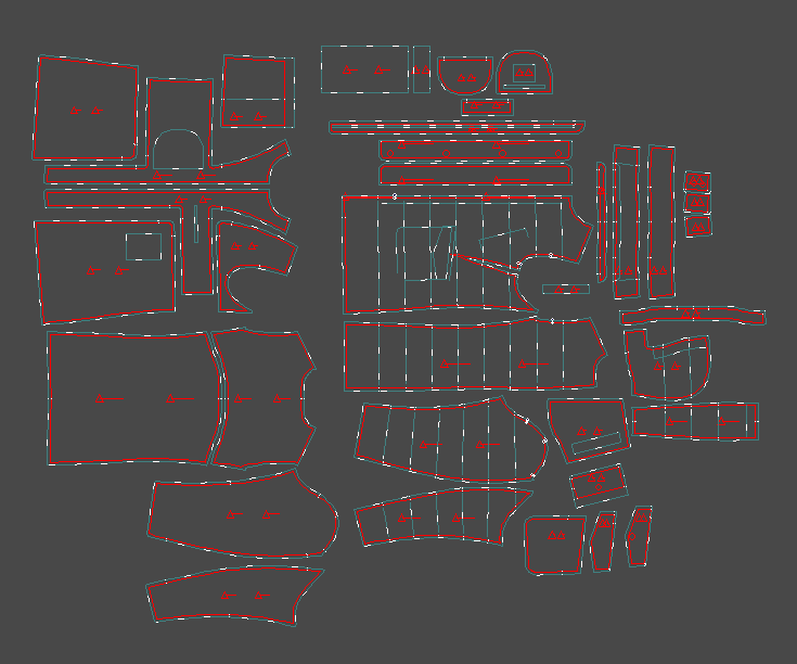 디자이너들과의 소통을 생각하며 소재를 생각하고 패턴을 작업해 나간다. 위에 보는 패턴은 처음 디자인의 겉감의 옷 조각들이다. 우리가 생각하는 것 이상으로 옷의 조각들은 숫자가 제법 많다. 위의 디자인을 이루는 총옷의 조각은 97개.